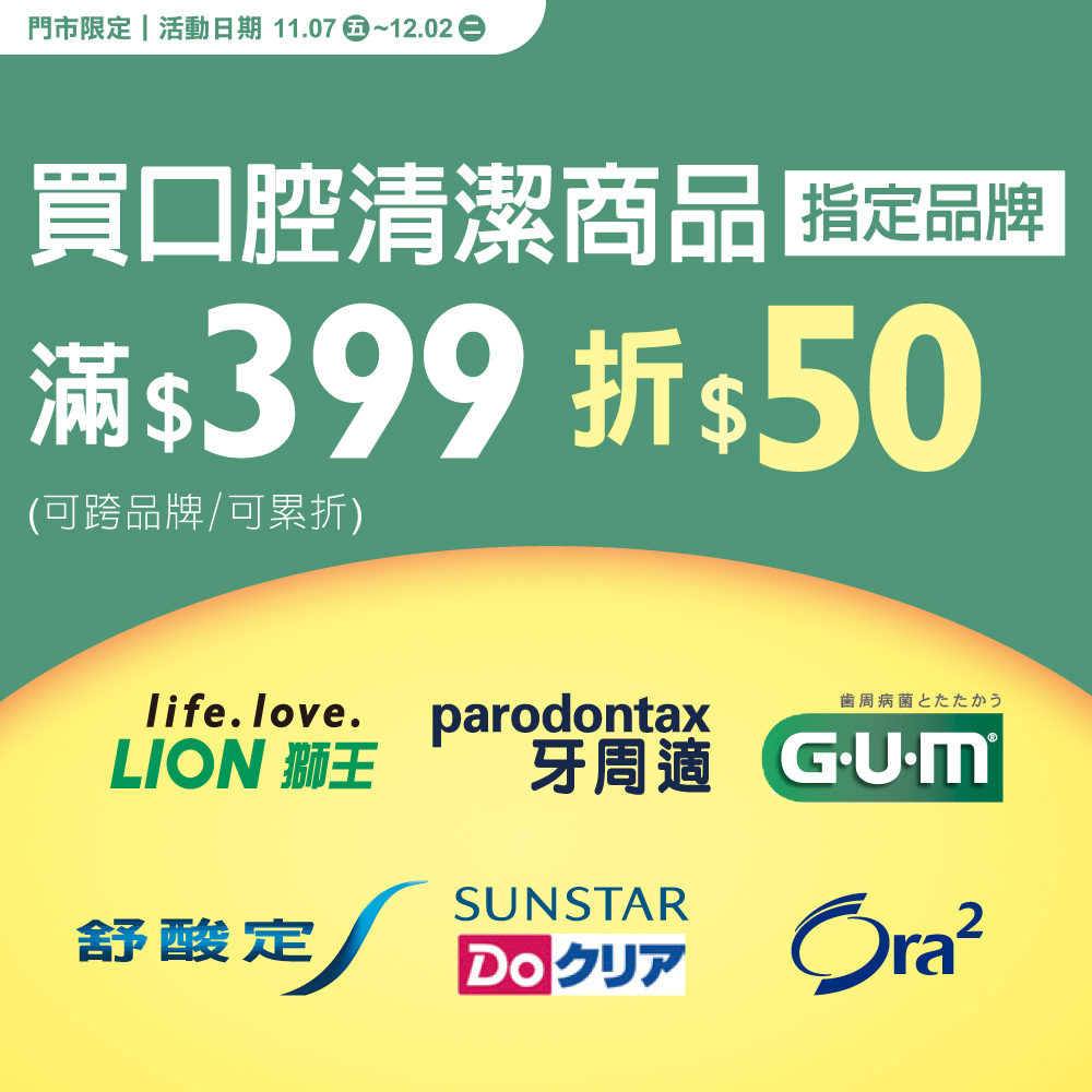 活動辦法:買口腔清潔商品指定品牌滿399元,折50元