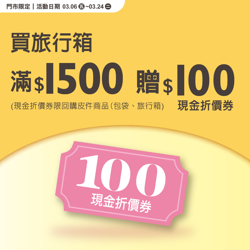活動辦法:買旅行箱商品滿$1500贈$100現金折價券