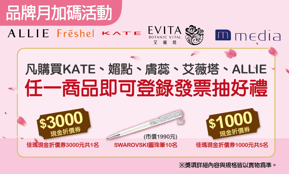 佳瑪會員(並已註冊佳瑪網路會員)於活動期間內購買佳瑪彩妝區凱婷、媚點、膚蕊、艾薇塔、ALLIE任一商品,即可登錄發票號碼獲得一次抽獎機會!