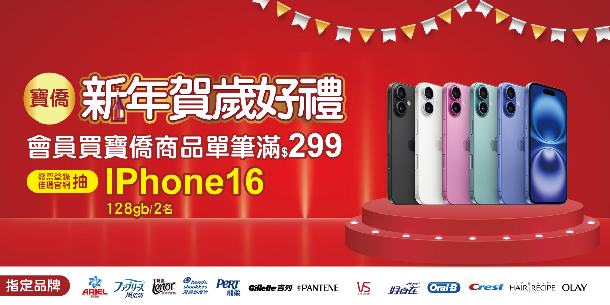 佳瑪會員(並已註冊佳瑪網路會員)於活動期間內購買佳瑪寶僑商品滿299元,即可登錄發票號碼獲得一次抽獎機會!