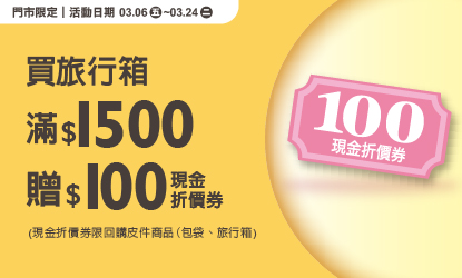 活動辦法:買旅行箱商品滿$1500贈$100現金折價券