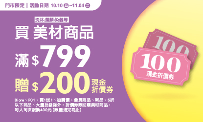 活動辦法:買洗沐/潔顏/染髮滿$799贈$200現金折價券