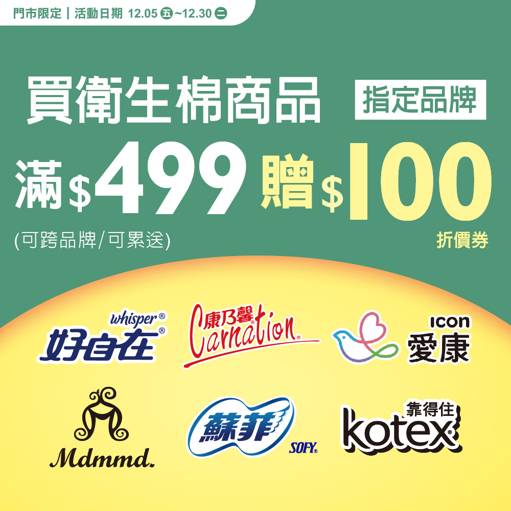 活動辦法:買衛生棉商品指定品牌滿$499贈100元現金折價券(可跨品牌/可累送)