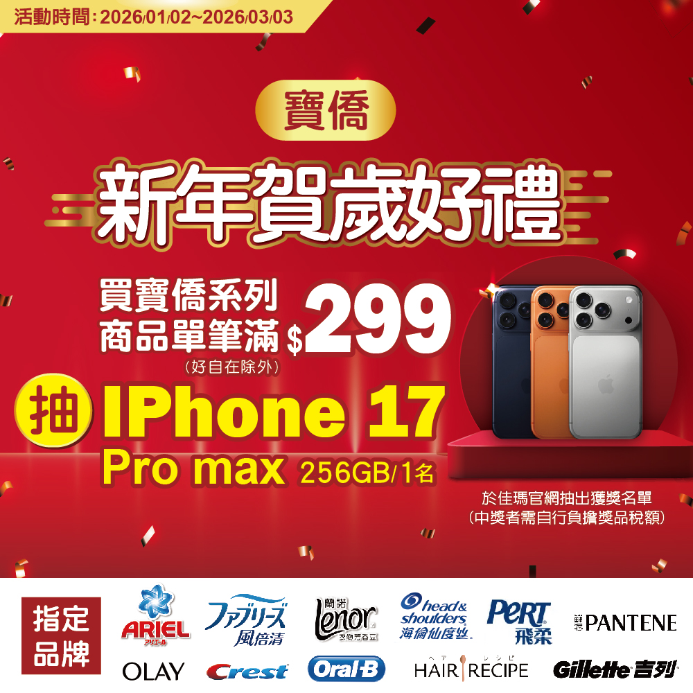 會員於佳瑪館內購買寶僑系列商品滿299元發票登錄抽iPhone 17 pro max!