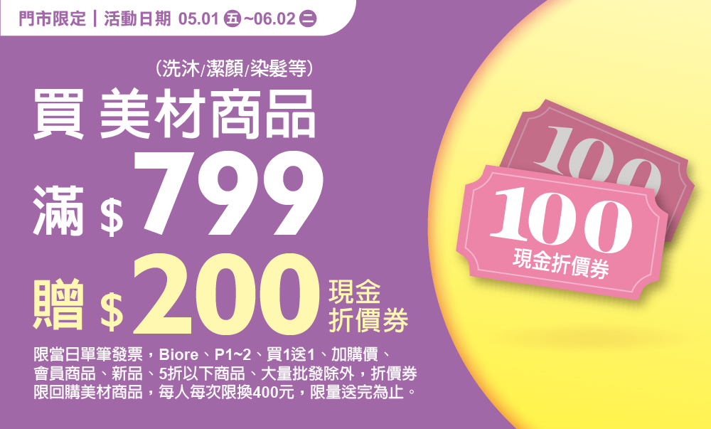 活動辦法:買美材商品滿$799贈$200現金折價券