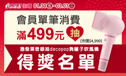 (1). 中獎名單於2026/03/20公告於佳瑪得獎名單網頁,如遇天災地變等不可抗力之因素,本公司保有權更改抽獎公告日期。